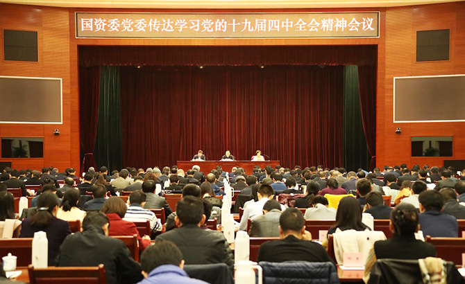 11月8日,国资委党委召开传达学习党的十九届四中全会精神会议,对国资委直属机关、中央企业和直管协会学习贯彻落实工作进行部署安排。国资委党委书记、主任郝鹏结合参加党的十九届四中全会现场聆听习近平总书记重要讲话的切身体会,结合国资国企实际作了宣讲,强调要深入学习贯彻党的十九届四中全会精神特别是习近平总书记在全会上的重要讲话精神,增强“四个意识”、坚定“四个自信”、做到“两个维护”,切实把思想和行动统一到全会精神上来,进一步完善国资国企制度体系,深化国资国企改革,增强国有经济竞争力、创新力、控制力、影响力、抗风险能力,做强做优做大国有资本,加快培育具有全球竞争力的世界一流企业,为实现“两个一百年”奋斗目标、实现中华民族伟大复兴的中国梦作出更大贡献。国资委副主任、党委委员赵爱明传达了全会公报和《中共中央关于坚持和完善中国特色社会主义制度、推进国家治理体系和治理能力现代化若干重大问题的决定》(以下简称《决定》)主要精神。国资委副主任、党委委员任洪斌主持会议。