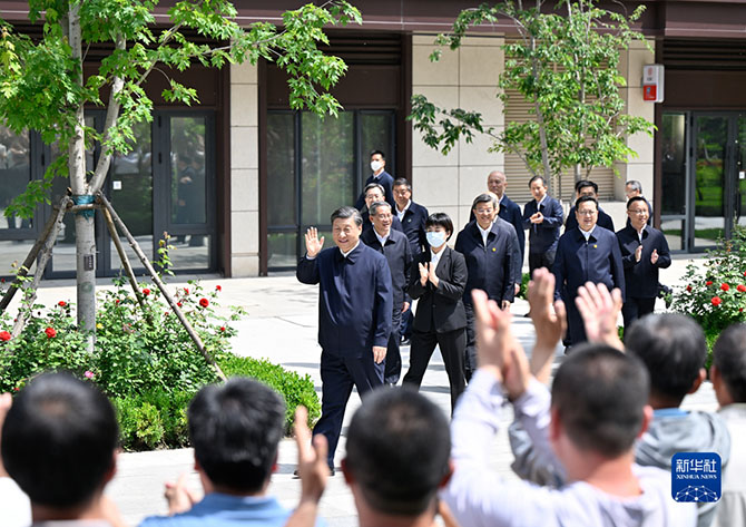 5月10日,中共中央总书记、国家主席、中央军委主席习近平在河北省雄安新区考察,并主持召开高标准高质量推进雄安新区建设座谈会。这是10日上午,习近平在容东片区南文营社区考察时向社区居民挥手致意。(新华社记者 殷博古 摄)